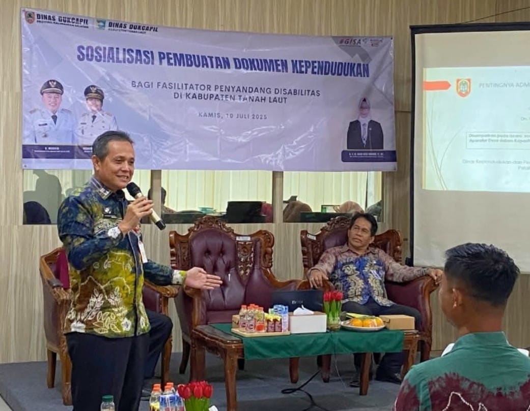 Asiasatunews.com, Tanah Laut – Dinas Kependudukan dan Pencatatan Sipil (Disdukcapil) Kabupaten Tanah Laut menggelar sosialisasi pentingnya administrasi kependudukan bagi penyandang disabilitas, Kamis (10/7/2025). Kegiatan berlangsung di Aula Disdukcapil dan diikuti 50 fasilitator desa yang terintegrasi dalam program SILARIS (Sistem Informasi Layanan Administrasi Kependudukan Terintegrasi dengan Desa).