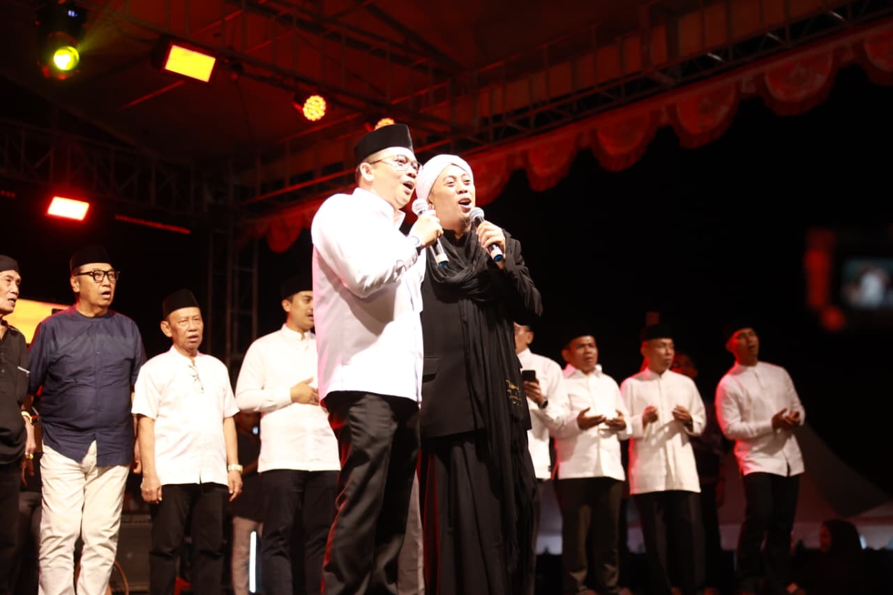 Ribuan masyarakat larut dalam lantunan shalawat yang digelar di lapangan depan Masjid Agung Al Falah, Kecamatan Simpang Empat, pada Jumat malam (15/8/2025).